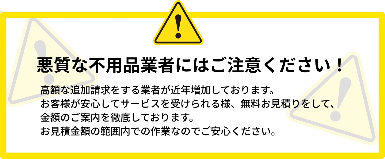 ※表示は税込価格です。 ※正式な料金は実際にスタッフが現地訪問させていただき、ご自宅の状況を拝見してからお見積りをさせていただきます。 ※材質や搬出状況・作業時間によって多少お値段が前後する事もありますのでご了承ください。