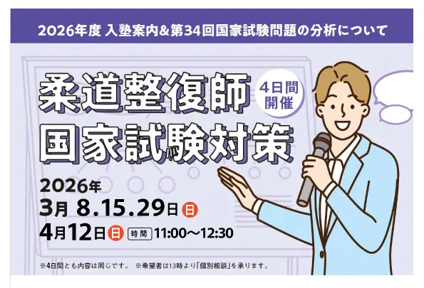 柔整は夏期・冬期・直前・前日等、鍼灸では、夏期・直前等の集中講座を開講予定です。