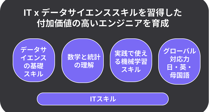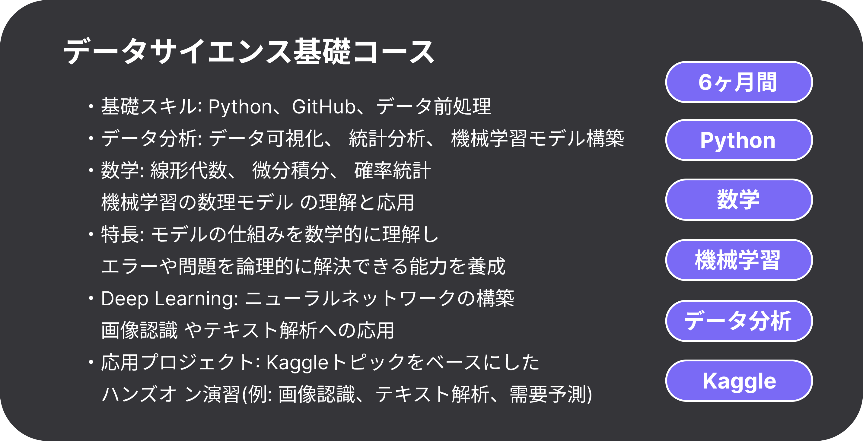 コンピューターサイエンスや数学をバックグラウンドに持つエンジニアやビジネスパーソン向けに、データサイエンス分野で即戦力となるための構造的なカリキュラムを提供しています。